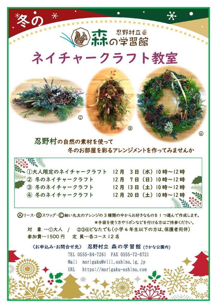 【申し込み先】 森の学習館 TEL 0555-84-7261 FAX 0555-72-8721 Mail morigaku@vill.oshino.lg.jp